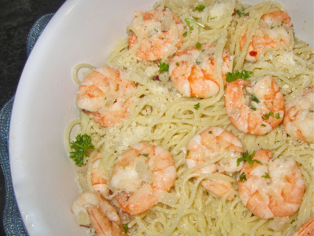 C'mon ladies...I know you are all with me on this one. Sometimes after a long day at work, nothing sounds better than a big glass of white wine. But what's even better is if you can pour a little bit of that glass right into what your cooking and end up with a fabulous tasting, easy weeknight meal. And that's exactly what this Shrimp Scampi with Angel Hair Pasta delivers. Like you even needed an excuse to buy a new bottle of Sauvignon Blanc!